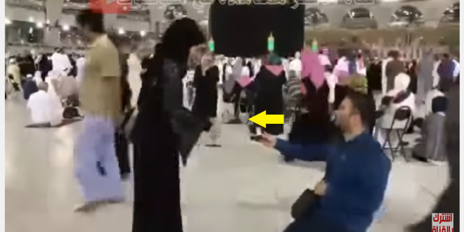 في مشهد غير معهود، شاهده النشطاء بمواقع التواصل الاجتماعي فقط في بعض العواصم العالمية وفي بعض الأماكن السياحية مثل برج إيفل بباريس، تقدم شاب للزواج من حبيبته أمام الكعبة الشريفة بمكة المكرمة.